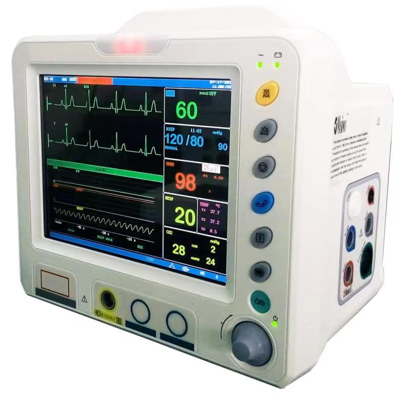 构成:产品一般为台式,由主机、显示器、无创血压、血氧饱和度、体温、呼吸、脉搏等监护单元(有些多参数患者监护设备还具有其他参数的检测功能。如:呼吸末二氧化碳、Masimo血氧饱和度)和各类电极、传感器组成。