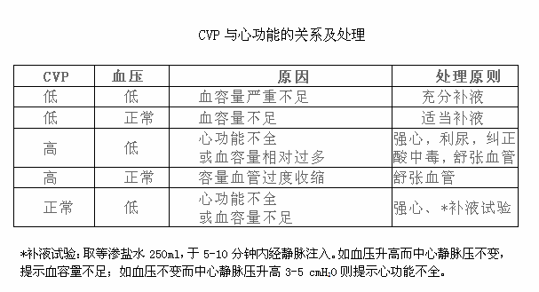 CVP为0~5cmH20时,表示心腔充盈差或循环血容量不足;大于15cmH20,可能为心功能不全、心包填塞、输液过多或外周血管收缩等所致,应参考临床症状与其它血流动力学监测指标如PCWP予以判断。