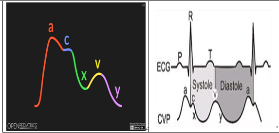 CVP实际是右心房收缩和舒张产生的压力变化。CVP波形变异较大,典型CVP波形包含五部分,三个峰(a,c,v)和两个下降段(x,y)。它们分别对应于心动周期的部分。因此,可根据CVP各波段的改变,评估心脏的机械活动。