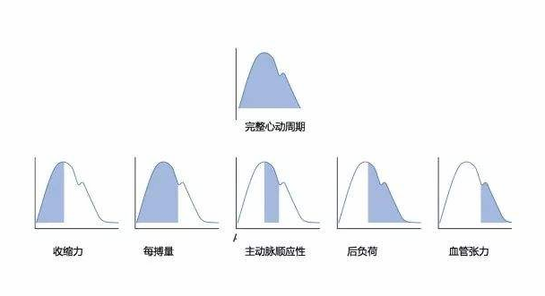 收缩压是衡量心肌收缩力的指标,图中所标记的在收缩期曲线下面积是衡量每搏量和心肌需氧量的指标