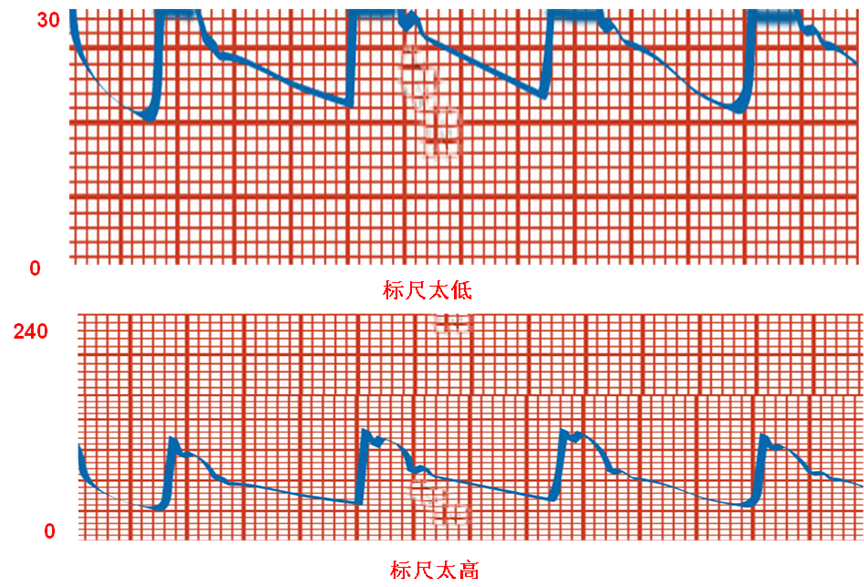 监测参数范围大,标尺范围设大,范围小,标尺范围设小,压力低时标尺范围设小;