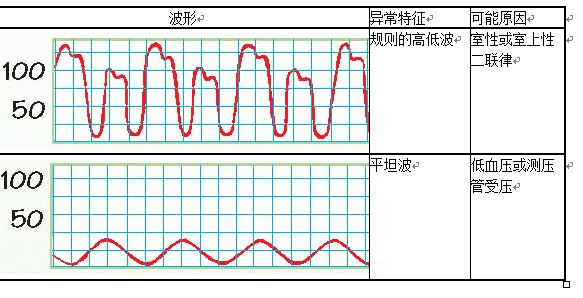 动脉留置针的位置不当或堵塞 动脉波形的收缩压明显下降,波形变的平坦。若管腔完全堵塞或通道脱离,波形消失。