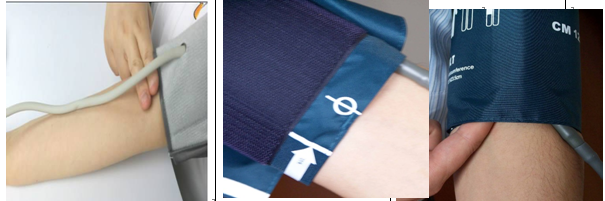 选择合适的袖带,并检查是否漏气。袖带下缘距肘窝横纹上