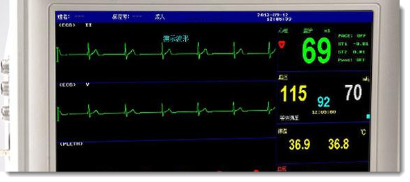 NIBP测量无波形显示,仅在左侧参数区,通常给出收缩压(115)、舒张压(70)和平均动脉压(92)。显示内容如图所示: